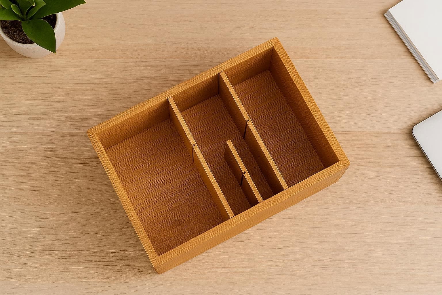 The removable dividers allow you to customize the interior space to fit larger items like notebooks, tablets, or art supplies. The hinged lid opens and closes smoothly, protecting contents from dust and debris. The compact size fits comfortably on most desks, while the sturdy base prevents tipping. It??s easy to maintain with a dry cloth or bamboo oil to preserve its natural shine.
