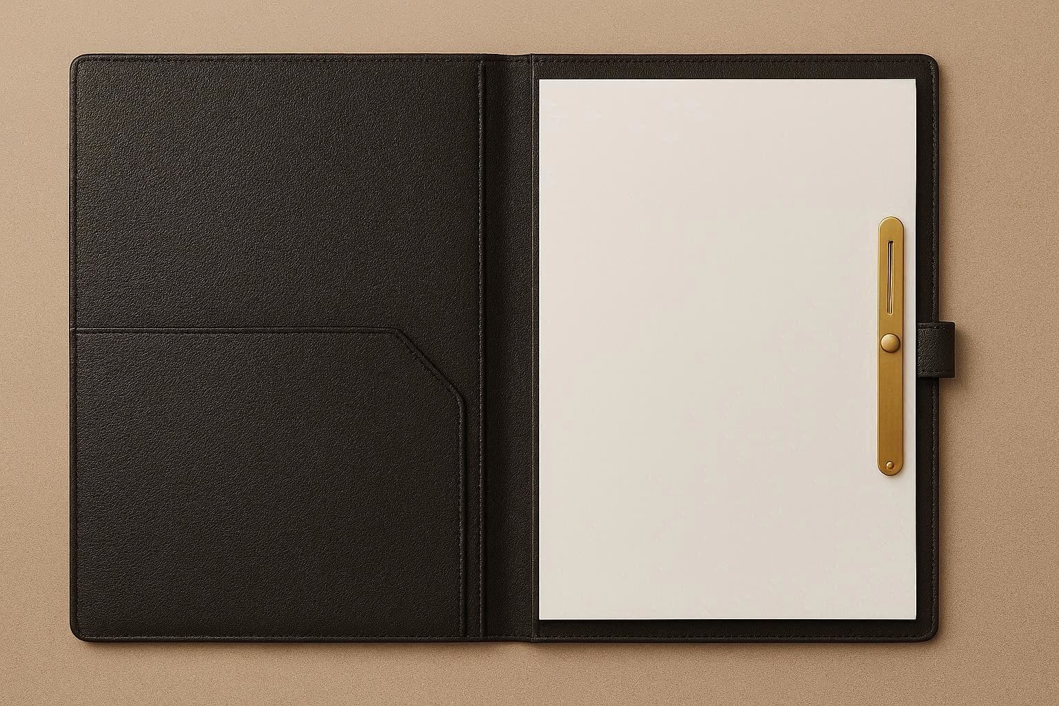 The exterior is made from high-quality, textured synthetic material that mimics genuine leather, providing durability and a premium feel. The interior is lined with smooth, non-abrasive paper to protect your documents. A discreet exterior pocket on the back is perfect for storing a smartphone, tablet, or additional papers that need quick access. The folder lies flat when opened for easy writing and presentation.